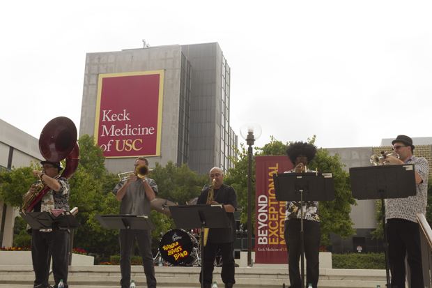 Attendees, many wearing blue flower leis, sipped coffee and chatted as they strolled through the quad, stopping by information booths from organizations such as the American Cancer Society and Cancer Support Community in Pasadena. Many attendees posed for pictures with Traveler, the USC mascot, as the sounds of the Bayou Brass Band echoed across campus.